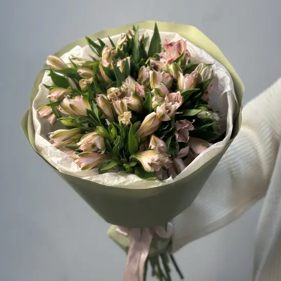 Нежные лепестки альстромерий напоминают акварельные мазки – их мягкие переходы от светло-розового к персиковому создают ощущение тепла и легкости. Благодаря естественной форме бутонов букет выглядит воздушно и элегантно, сохраняя при этом структуру.
