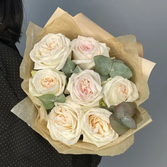 Букет составлен из семи пионовидных роз White O’Hara с нежными кремово-белыми лепестками, дополненных веточками эвкалипта для свежести и объема. Композиция небольшого размера – около 30 см в высоту – упакована в крафтовую бумагу, подчеркивающую естественную элегантность. Идеальный выбор для романтического жеста, нежного поздравления или украшения интерьера в скандинавском стиле.