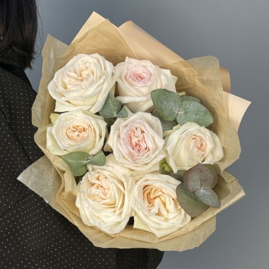 Букет пионовидных роз White O'Hara и эвкалипта S