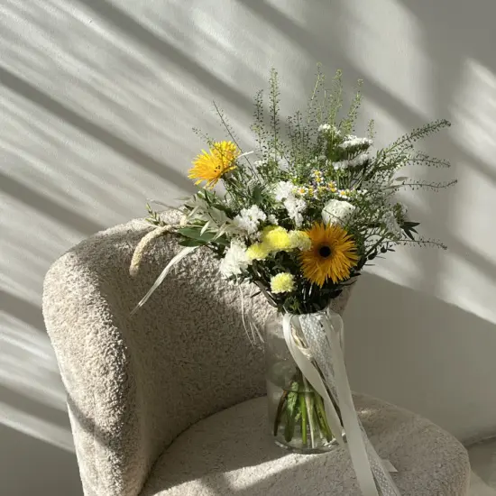 Свободные линии и естественные формы напоминают луговые травы, собранные в ветреный летний день. Приглушенные оттенки зелени, кремовые и пастельные акценты создают ощущение легкости и гармонии. Композиция словно только что принесена с прогулки – живая, дышащая, наполненная природной грацией.