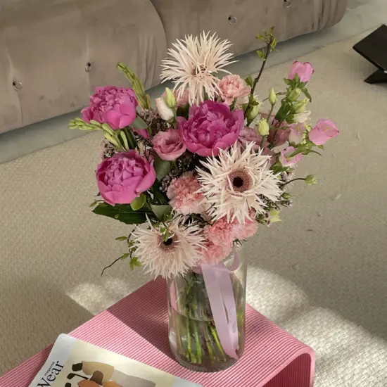 Невероятные герберы сорта cream springs, шикарные яркие пионы с садовым ароматом, полевая кампанула, шарики розовой эустомы и стойкие гвоздики собраны вместе для того, чтобы ваш дом украшал очаровательный букет!Размер букета - около 30см в ширину, высота букета зависит от вашей вазы - можем подрезать под любой размер