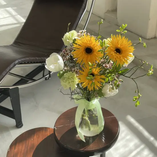 Солнечные герберы и нежные тюльпаны создают динамичный контраст с плотными соцветиями гвоздик, а воздушные веточки добавляют легкость. Яркие краски напоминают о лете даже в пасмурный день – букет выглядит свежо и современно, без излишней вычурности.