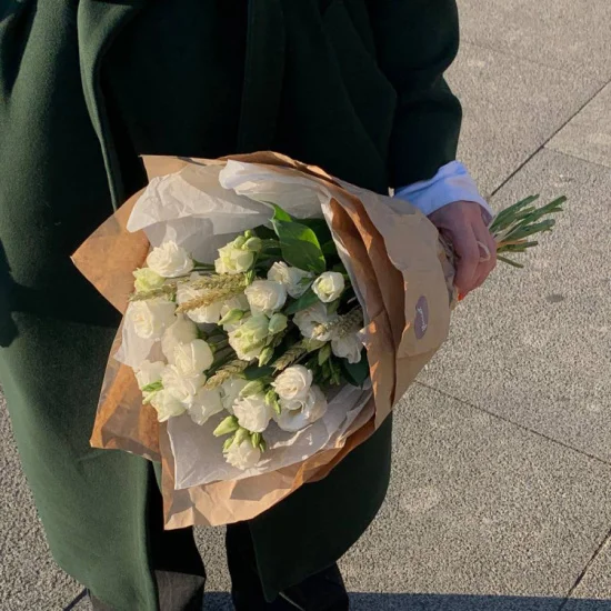Нежные лепестки эустомы переплетаются с теплыми оттенками пшеничных колосьев, создавая ощущение легкости и гармонии. Сочетание белого и золотого придает букету утонченность – словно утренний свет, пробивающийся сквозь поле. Композиция излучает спокойствие и чистоту, напоминая о тихих, искренних моментах.