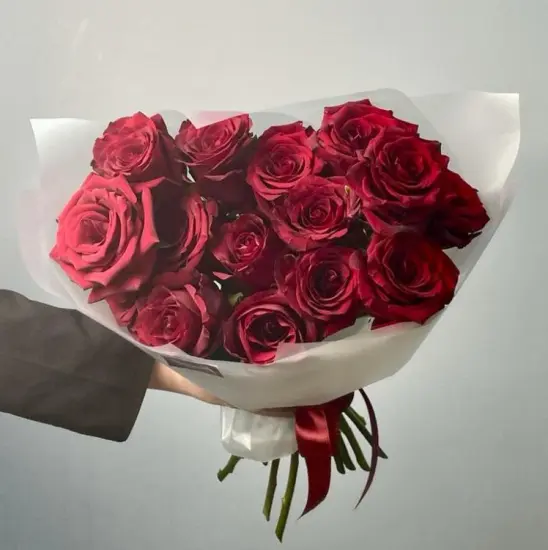 Глубокий красный тон лепестков создает атмосферу страсти и элегантности, а мягкий аромат добавляет ноту изысканности. Букет выглядит одновременно сдержанно и выразительно – сочетание традиционной формы и безупречного качества цветов делает его универсальным решением.
