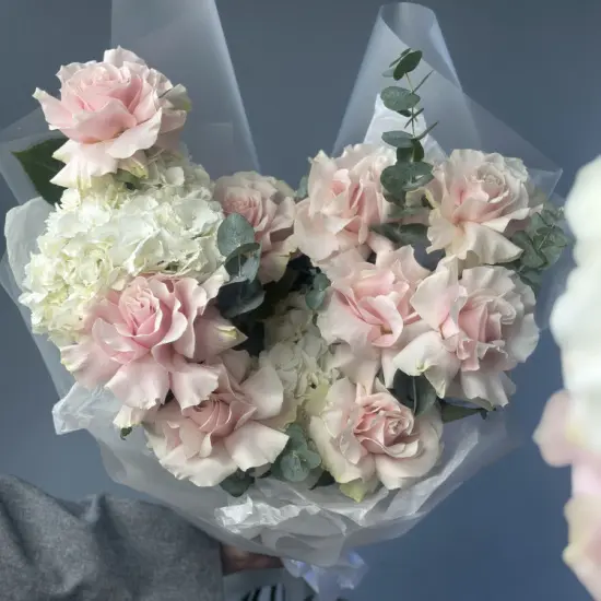 Нежный дуо-букет из премиальных роз сорта Pink Mondial нежно-розового оттенка, пышных белых гортензий и эвкалипта поможет передать ваши нежные чувства. Крупные розы со множеством нежных лепестков, вручную вывернутых нашими флористами, обладают нежностью и легким ароматом.Размер дуо-букета - около 50 см в ширину 8900