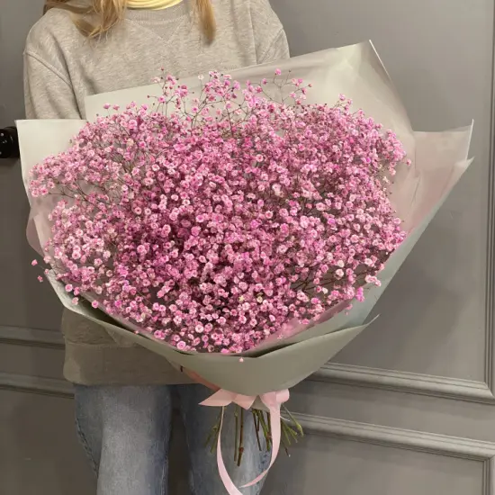 Букет из 15 веточек душистой гипсофилы розового оттенка, украшенных стильной упаковкой, поднимет настроение и приятно удивит.Гипсофила - стойкий и пышный цветок, на веточке которого множество маленьких шариков-соцветий, имеющих приятный медовый аромат.