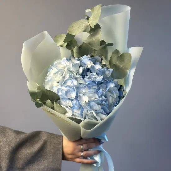 Пышные соцветия гортензии создают ощущение воздушности и легкости, а серебристые листья эвкалипта добавляют благородную сдержанность. Голубые оттенки вызывают ассоциации с прохладной свежестью – букет словно вобрал в себя мягкий свет и прозрачность летнего неба.