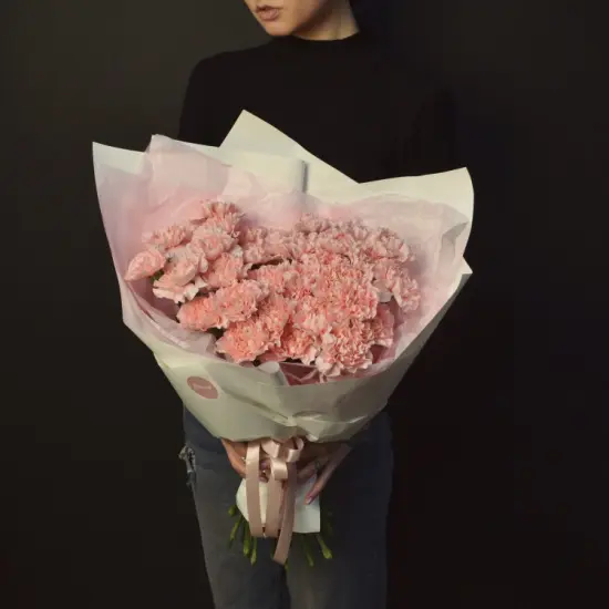 Розовые гвоздики создают ощущение нежности и тепла, их кружевные лепестки переливаются мягкими полутонами. Композиция выглядит одновременно лаконично и изысканно – без лишней пышности, но с выразительным характером.
