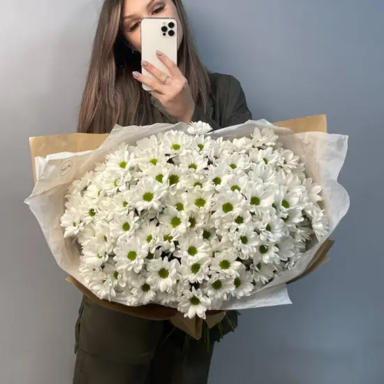 Стандартно украшаем букеты хризантем лентой. Вы можете дополнительно украсить букет изящной упаковкой, которая добавит композиции пышность и элегантность, нажав кнопку "Добавить упаковку". 11550