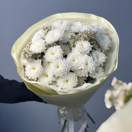 Букет из 5 веточек кустовых хризантем сорта Baltica, напоминающих пышные звездочки. Букет украшен ваксфлауэром и упаковкой. Хризантемы - одни из самый стойких цветов, что делает их любимицами многих.Размер букета из 5 кустовых хризантем - около 30 см 4420