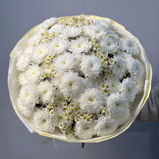 Солнечные соцветия матрикарии перекликаются с нежными лепестками хризантемы, создавая ощущение тепла и свежести. Контраст ярко-желтого и белого напоминает о летнем луге – естественная гармония без лишней вычурности, но с выразительным характером.