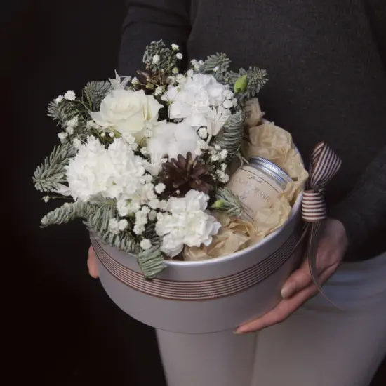 Светлые оттенки зелени и хлопка напоминают о первом снеге, а фактурные детали добавляют глубину. Тонкий аромат свечи усиливает ощущение тепла – композиция словно вбирает в себя атмосферу зимнего утра с его тишиной и свежестью.