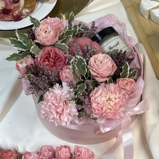 Подарочный набор в шляпной коробочке, состоящий из стойкого цветочного набора пионовидных роз, стойких гвоздик, веточек лимониума, питтоспорума, соцветий хлопка и ароматной соевой свечи - стильный и приятный сюрприз, который запомнится надолго!Диаметр композиции - 21см