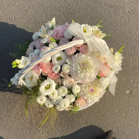 Трепетная и нежная цветочная композиция, выполненная из россыпи пионовидных роз, веточек нежной эустомы, фактурных гвоздик, сезонных георгинов, хризантем, стойких альстромерий и паникума в плетеной корзине, поможет выразить ваши нежные чувства или слова благодарности!Размер пышной цветочной корзины - около 35 см