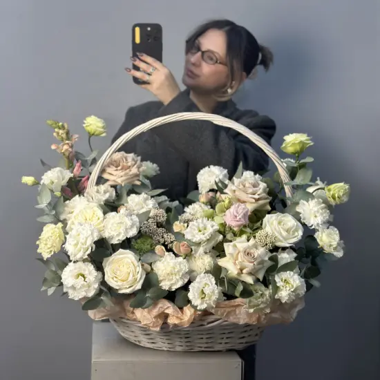 Изящная цветочная композиция большого размера, выполненная из россыпи пионовидных и классических роз, кружевных гвоздик, антирринума, шариков озотамнуса, эустомы и нежной зелени в плетеной корзине, поможет выразить ваши нежные чувства или слова благодарности!Размер пышной цветочной корзины - около 80-90 см