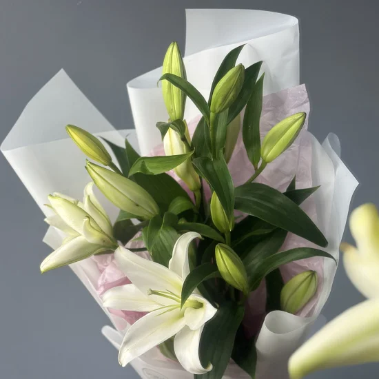 Белые лилии с их благородной формой и чистым цветом создают ощущение свежести и гармонии. Широкие лепестки, слегка изогнутые в движении, придают букету лёгкую динамику, а тонкий аромат добавляет ноту изысканности. Лаконичная упаковка подчёркивает естественную красоту цветов, не перегружая образ.