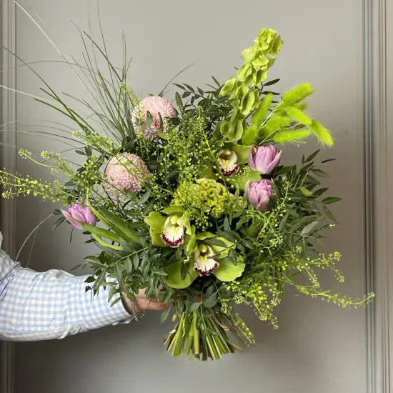 Мужской букет с интересным цветочным составом, собранный из молюцеллы, сезонных тюльпанов, фактурных хризантем и ярких орхидей, утопает в зелени берграса, тиласпии и писташа.Высота мужского букета Лесной - около 50 см