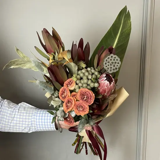 Глубокие винные тона создают благородную атмосферу, сочетая экзотическую графику протеи и лотоса с мягкими линиями розы. Контраст бархатистой брунии и серебристого эвкалипта добавляет динамики, а стрелиция придает композиции выразительный ритм. Букет выглядит одновременно мощно и элегантно – как деталь безупречного стиля.