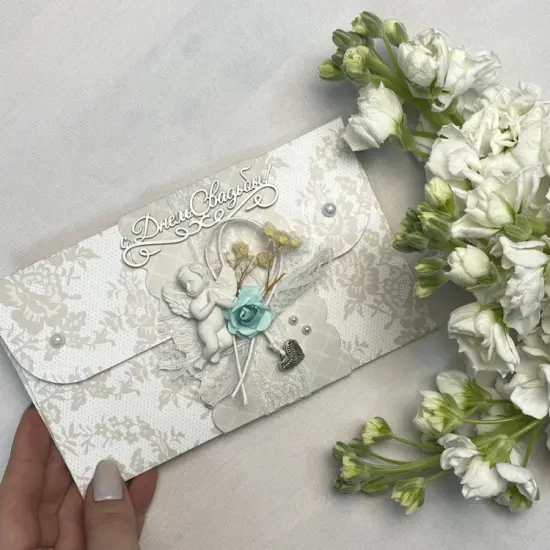Открытка-конверт ручной работы "С Днем свадьбы" светлая