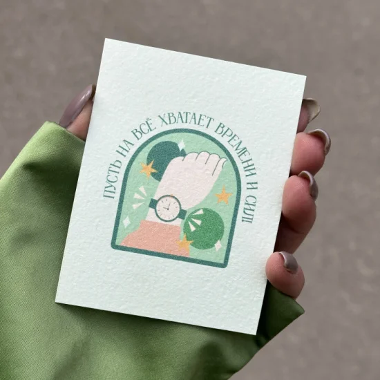 Эта открытка словно напоминает о том, что время – не враг, а союзник. Она создает ощущение спокойствия и уверенности, будто в руках держишь частицу тишины среди суеты. Теплые слова и лаконичный дизайн помогают почувствовать, что все возможно – стоит только сделать глубокий вдох и шаг вперед.
