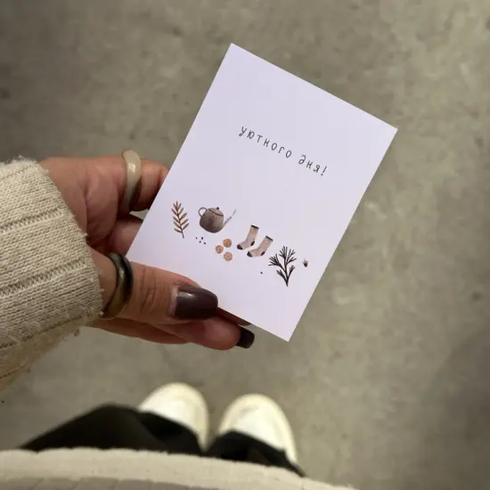 Открытка "Уютного дня!" выполнена в теплых пастельных тонах – нежные бежевые, кремовые и мягко-розовые оттенки создают ощущение комфорта. Дизайн дополнен милыми деталями – вязаными узорами, чашкой ароматного чая или укутанным в плед котенком. Формат – классический А6, идеально подходящий для передачи теплых пожеланий. Открытка уместна для любого случая – будь то поддержка близкого человека, напоминание о заботе или просто знак внимания в обычный день.