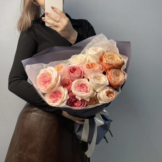 Букет из 15 пионовидных роз различных сортов (микс) - изящный букет, готовый выразить ваши чувства или слова благодарности.Размер очаровательного букета из 15 пионовидных и садовых роз различных сортов - около 40 см