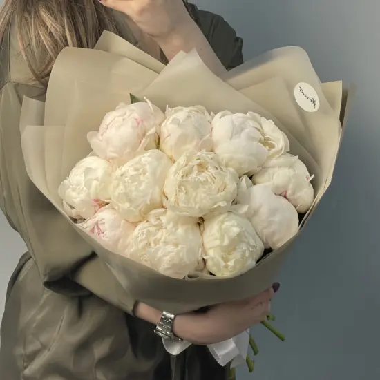 Пышные благоухающие шарики-пионы, раскрывающиеся в тепле один за одним - одни из самых эффектных цветов. Крупные белые пионы, собранные в изящный букет, помогут выразить ваши чувства и запомнятся надолго.Размер букета из 11 крупных пионов белого цвета в нежной упаковке - около 40 см 14680