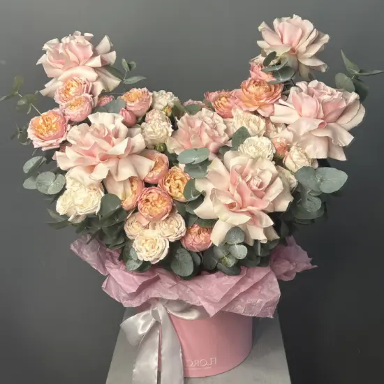 В составе букета, выполненного в шляпной коробке, сошлись роскошные пионовидные и французские розы различных сортов и пыльно-зеленый эвкалипт.