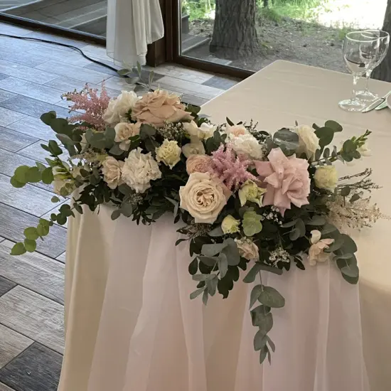 Бело-розовая композиция для украшения стола молодоженов, составленная из крупных кремовых роз, эустомы, фактурной астильбы, лимониума и эвкалипта.Композиция выполнена на флористическом поддоне. Размер композиции - 45-50 см 11400