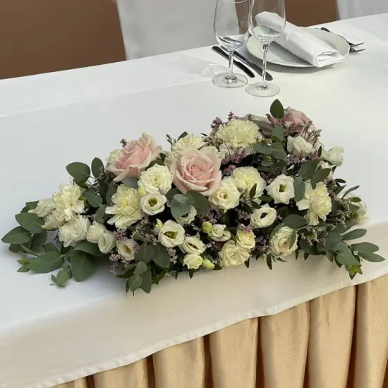 Нежная композиция для украшения стола молодоженов, составленная из крупных кремовых роз, эустомы, шариков гвоздик, веточек лимониума и эвкалипта.Композиция выполнена на флористическом поддоне. Размер композиции - 40-45 см 12080