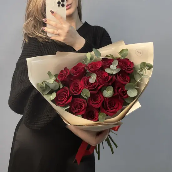 Букет из 15 бархатных роз сорта Explorer, украшенных веточками эвкалипта и минималистичной упаковкой. Розы сорта Explorer обладают отличной стойкостью и нежным цветочным ароматом.Идеальная классика для любого повода!