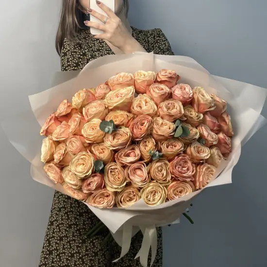 Нежные лепестки с теплым персиковым отливом создают ощущение мягкого свечения, а зелень эвкалипта добавляет свежести и легкости. Благородный оттенок и плотные бутоны передают элегантность, а естественная упаковка подчеркивает природную красоту.