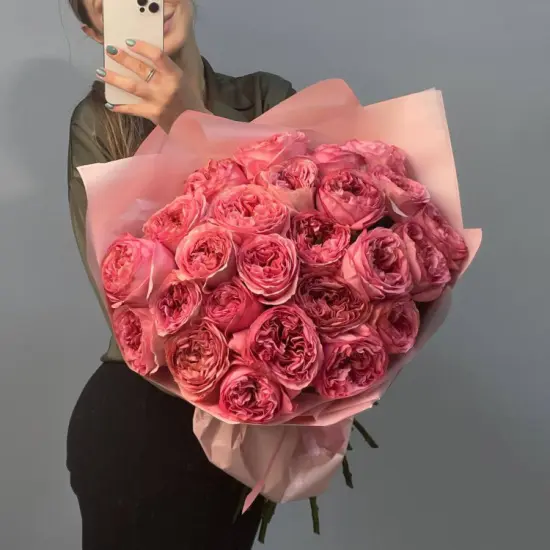 Букет из 25 изящных кружевных роз сорта Pink Expression розового оттенка, упакованных в стильную пленку, способен удивить и создать чудесное настроение.Розы сорта Pink Expression из упругих бутонов раскрываются в невероятно пышные чашечки, что делает сорт особенным.