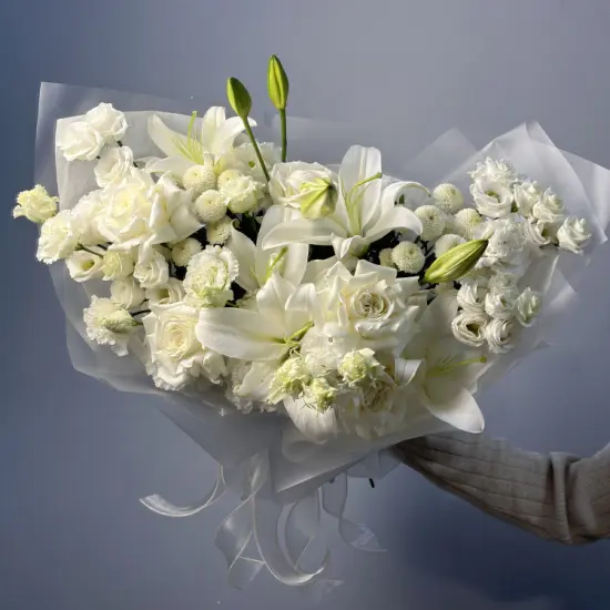 Свежесть белых лепестков, переплетающихся с зеленью, создает ощущение легкости и чистоты. Крупные бутоны лилий и роз контрастируют с нежными соцветиями эустомы, добавляя объем и динамику. Композиция выглядит воздушной, но сохраняет благородную лаконичность.