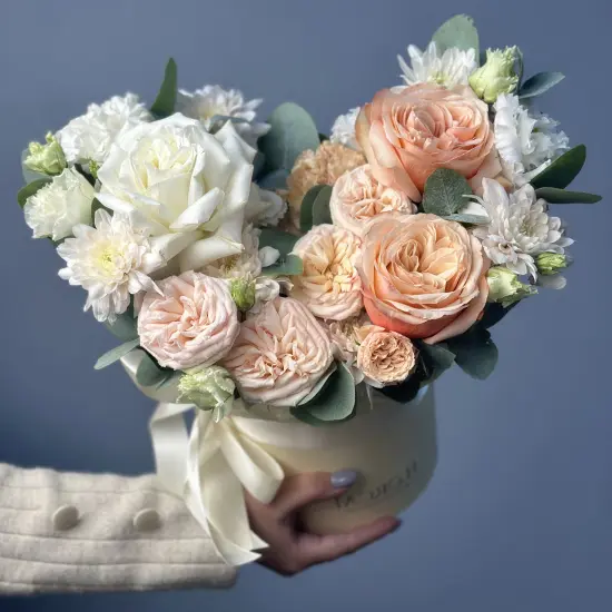 Воздушная цветочная композиция в нежных бело-персиковых оттенках, в цветочный состав которой вошли очаровательные пионовидные розы сортов Playa Blanca и Kahala, россыпь кустовых роз, изящная эустома, веточки эвкалипта и сортовые хризантемы.Цветочная композиция, собранная в коробочке, создаст нежное настроение, приятно удивит своим ароматом и стойкостью.