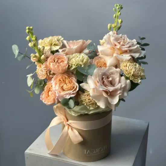 Изящная композиция в шляпной коробочке с медовой маттиолой, очаровательными розами Juliet и Quicksand, карамельными гвоздиками и веточками эвкалипта.Букеты в шляпных коробках легко транспортировать, а также для них не требуется ваза, что делает такие букеты очень удобными и простыми в уходе!