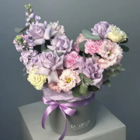 Пурпур — нежный сборный букет в шляпной коробке, выполненный в лиловых тонах. В составе: фактурные розы, веточки эвкалипта, воздушная маттиола, ажурные гвоздики и нежная эустома. Букет доступен в трех размерах: S, M и L.Размер сборного букета - около 45 см