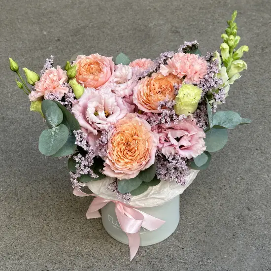 Мягкие переливы розового, кремового и персикового создают ощущение воздушности и легкости. Тонкие линии лимониума и эвкалипта добавляют графичности, а бархатистые лепестки роз придают композиции объем и нежность. Букет напоминает утренний сад – свежий, наполненный светом и гармонией.