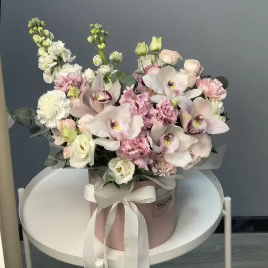 Букет в шляпной коробочке с изящной орхидеей, пышной эустомой, кружевными гвоздиками, маттиолой и нежной зеленью - прекрасный выбор для любого повода.Размер букета в шляпной коробке Совершенство M - около 40-45 см