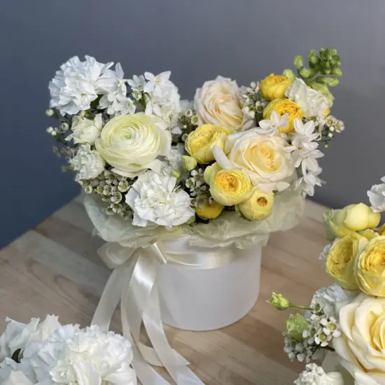 Нежная цветочная композиция, выполненная из россыпи пионовидных и классических роз, сезонных нарциссов, фактурных гвоздик, белой эустомы и свежей зелени, наполнит пространство нежным ароматом весны.Размер цветочной коробочки - около 30-35 см