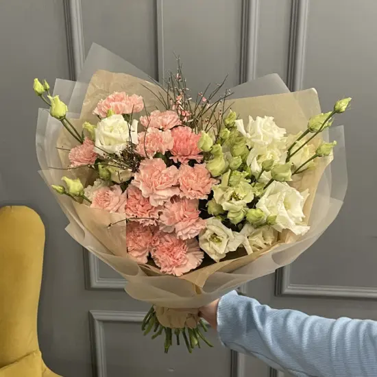 Сдержанная элегантность достигается за счет сочетания мягких оттенков и фактур: матовые лепестки гвоздик перекликаются с шелковистой эустомой, а легкие соцветия генисты добавляют объем. Букет словно окутан дымкой – неброский, но запоминающийся, с тонким балансом между утонченностью и естественной свежестью.