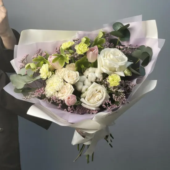Дыхание весны — воздушный сборный букет в светлых тонах, составленный из нежных пионовидных роз сорта White O'Hara с насыщенным ароматом, соцветий хлопка, кустовых роз, хелеборуса, сезонных тюльпанов, лимониума и веточек эвкалипта.Размер букета - около 40-45 см