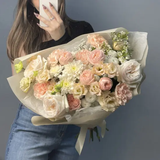 Сборный букет Кейт из премиум-раздела, оттенками напоминающий персиковый пломбир, в составе которого сошлись пионовидные и классические розы, ваксфлауэр, нежная эустома, гвоздики и лимониум, поможет передать ваши трепетные и нежные чувства. Размер сборного букета Кейт - около 50-60 см