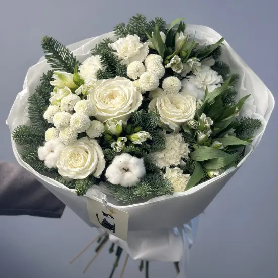 В составе букета: пушистая хвоя, сортовые розы, соцветия хлопка, стойкие альстромерии и сортовые гвоздики