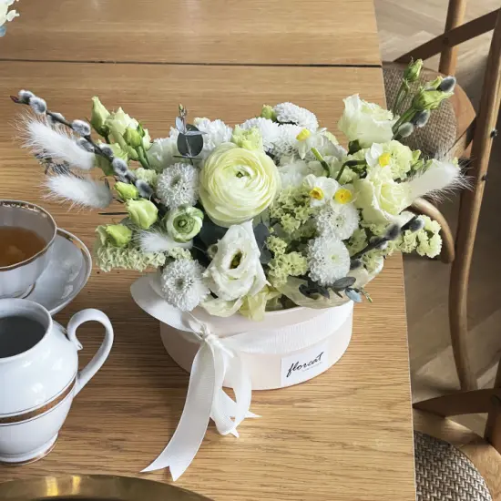 Нежная коробочка с теплым весенним настроением, составленная из ранункулюсов, эустомы, веточек вербы, нарциссов, фактурных сортовых хризантем и статицыРазмер пасхальной композиции S - около 25-30 см