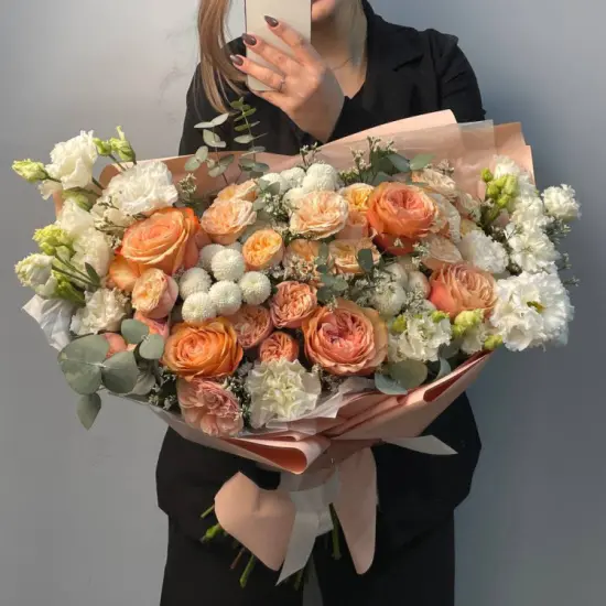 Мягкие персиковые и кремовые оттенки создают ощущение нежности и тепла. Объемные бутоны роз гармонируют с воздушными соцветиями эустомы, а зелень эвкалипта добавляет свежести. Букет выглядит утонченно – без излишней пышности, но с безупречной детализацией.