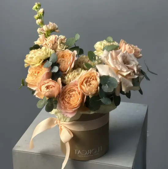 Изящная композиция в шляпной коробочке с медовой маттиолой, очаровательными розами Juliet и Quicksand, карамельными гвоздиками и веточками эвкалипта.Букеты в шляпных коробках легко транспортировать, а также для них не требуется ваза, что делает такие букеты очень удобными и простыми в уходе!