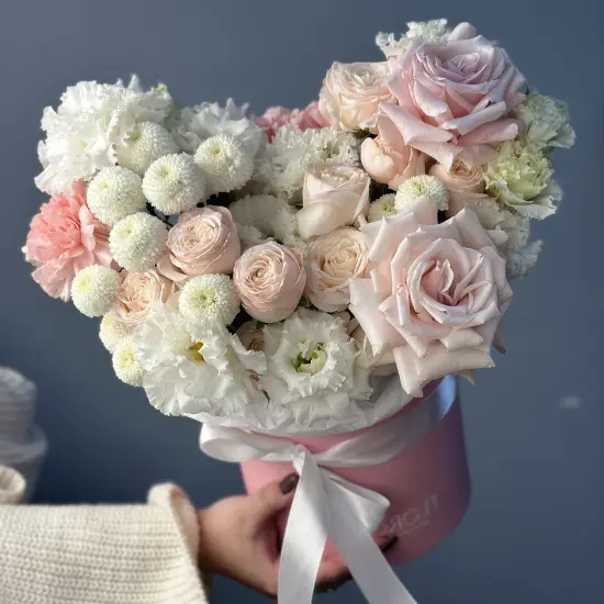 Сборная композиция сочетает кружевные французские розы, эустому, кустовые розы и ажурные гвоздики. Цветы расположены на флористической губке, которая поддерживает свежесть и продлевает срок жизни растений. Диаметр готовой работы составляет 35 см – идеальный вариант для декорирования интерьера или же подарка. И мимо такого сюрприза никто не пройдет мимо – необычные оттенки и текстура точно привлекут внимание. Букет оживает благодаря каждому цветку: кружевные французские розы придают элегантность, кустовые розы с пионовидным раскрытием создают объем и мягкость, эустома добавляет легкость и воздушность, а ажурные гвоздики – изысканную текстуру.