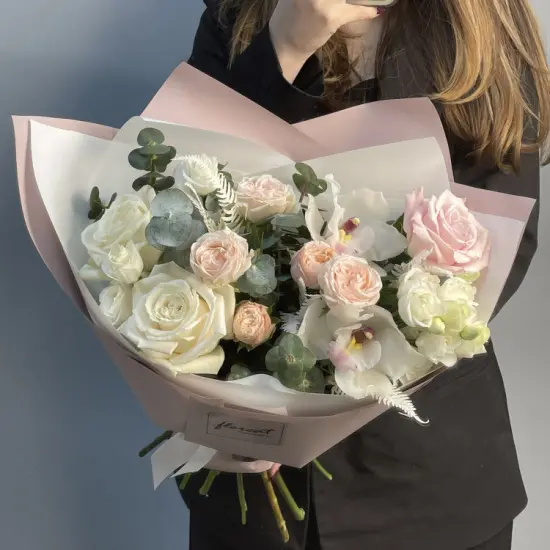 Свежесть зелени папоротника и эвкалипта гармонично сочетается с бархатистыми лепестками роз, создавая ощущение лёгкости и воздушности. Пастельные оттенки розового, белого и сиреневого напоминают утренний сад – безмятежный и наполненный тонким ароматом.