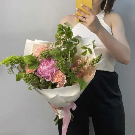 Каждый букет собирается вручную с учетом доступных цветов – оттенки и размеры могут варьироваться, но стиль и качество остаются неизменными. Флористы тщательно подбирают материалы, сохраняя гармонию и настроение композиции. Любая замена выполняется с учетом первоначальной задумки, не нарушая целостности образа.